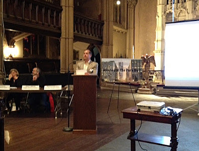 Is the sum greater than the parts? Should we connect the dots? Are we strongest uniting in these fights because its all the same "pay to play" investigations and same people being investigated? Judi Francis answered yes and commended to the audience the coalition group New Yorkers for a Human Scale City that had just hours before had a very well covered press conference on the steps of City Hall with member groups like Citizens Defending Libraries and Save the View Now participating. Save the View Now's Steve Guterman's remarks at that earlier event got even better coverage than his eloquence at the evening Brooklyn Heights event.
