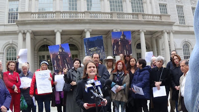 Here are links to the coverage of the press conference, a coalition of co9mmunity groups convened by New Yorkers fora Human Scale City that included Citizens Defending Libraries bringing a goodly number of Library Defenders (and some banners and signs) to the crowd. We called for a halt to and an investigation of the