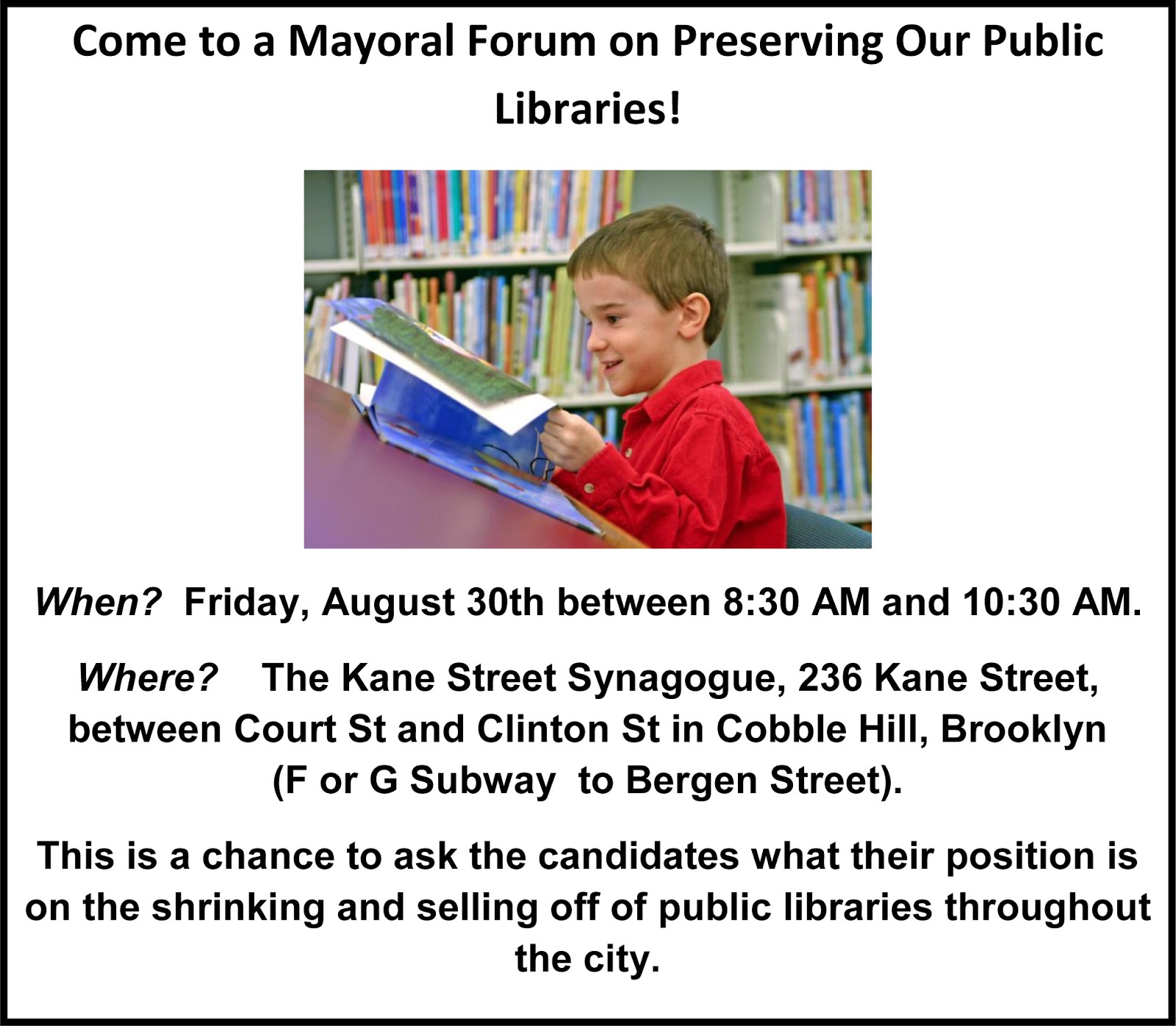(In addition you may be interested in: Public Advocates and Comptroller Candidates Forum on Libraries Held September 4, 2013.)